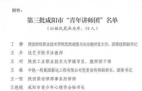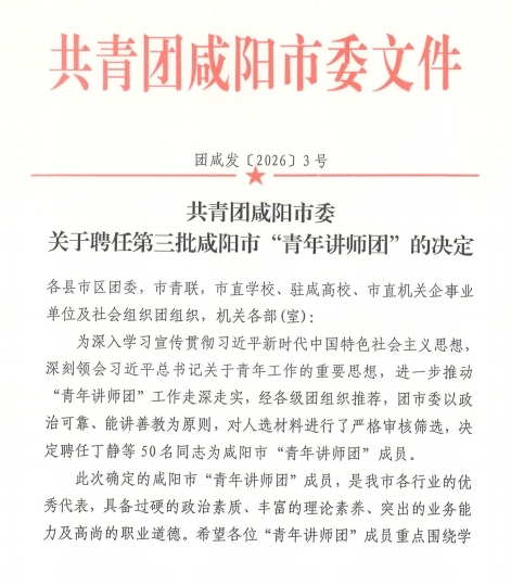 近日,共青团咸阳市委发文,公布了《关于聘任第三批咸阳市“青年讲师团”的决定》,我校马克思主义学院黄晓月老师凭借扎实的理论素养和宣讲能力,入选第三批咸阳市“青年讲师团”名单。